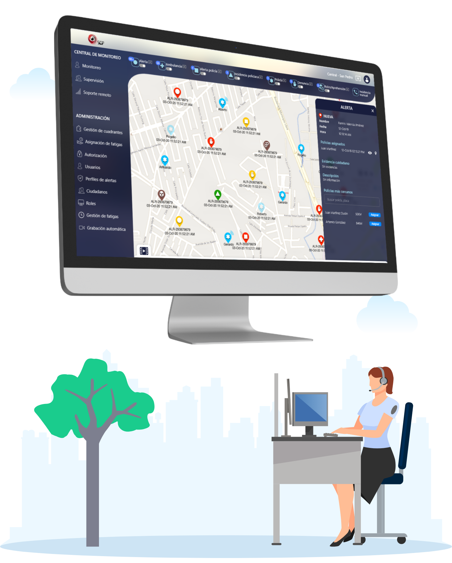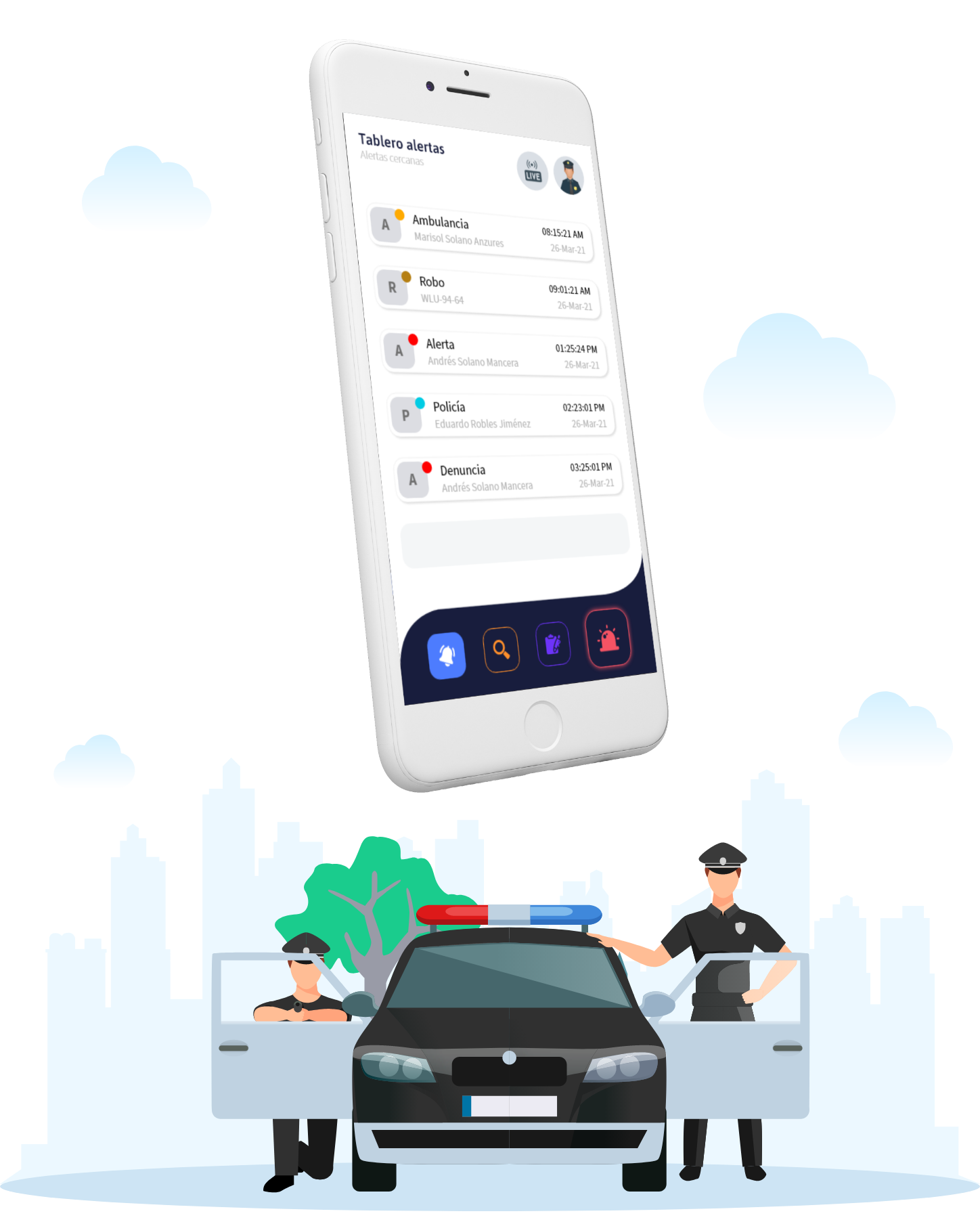 El módulo policía permite dar seguimiento a las alertas generadas por los ciudadanos, así como solicitar apoyo en caso de necesario y generar alertas de forma manual.