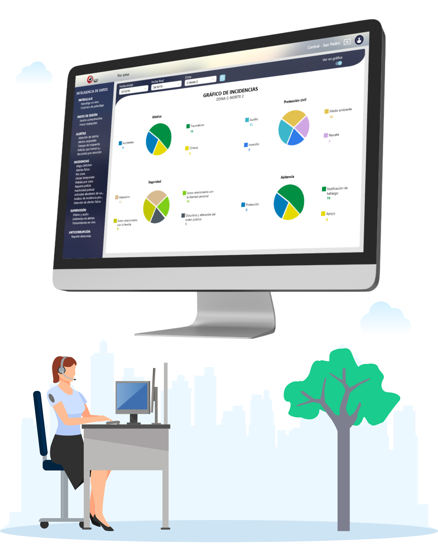 El módulo central de mando es el encargado de coordinar y administrar los elementos operativos, así como proporcionar herramientas para que la atención a la ciudadanía se realice de forma eficaz.